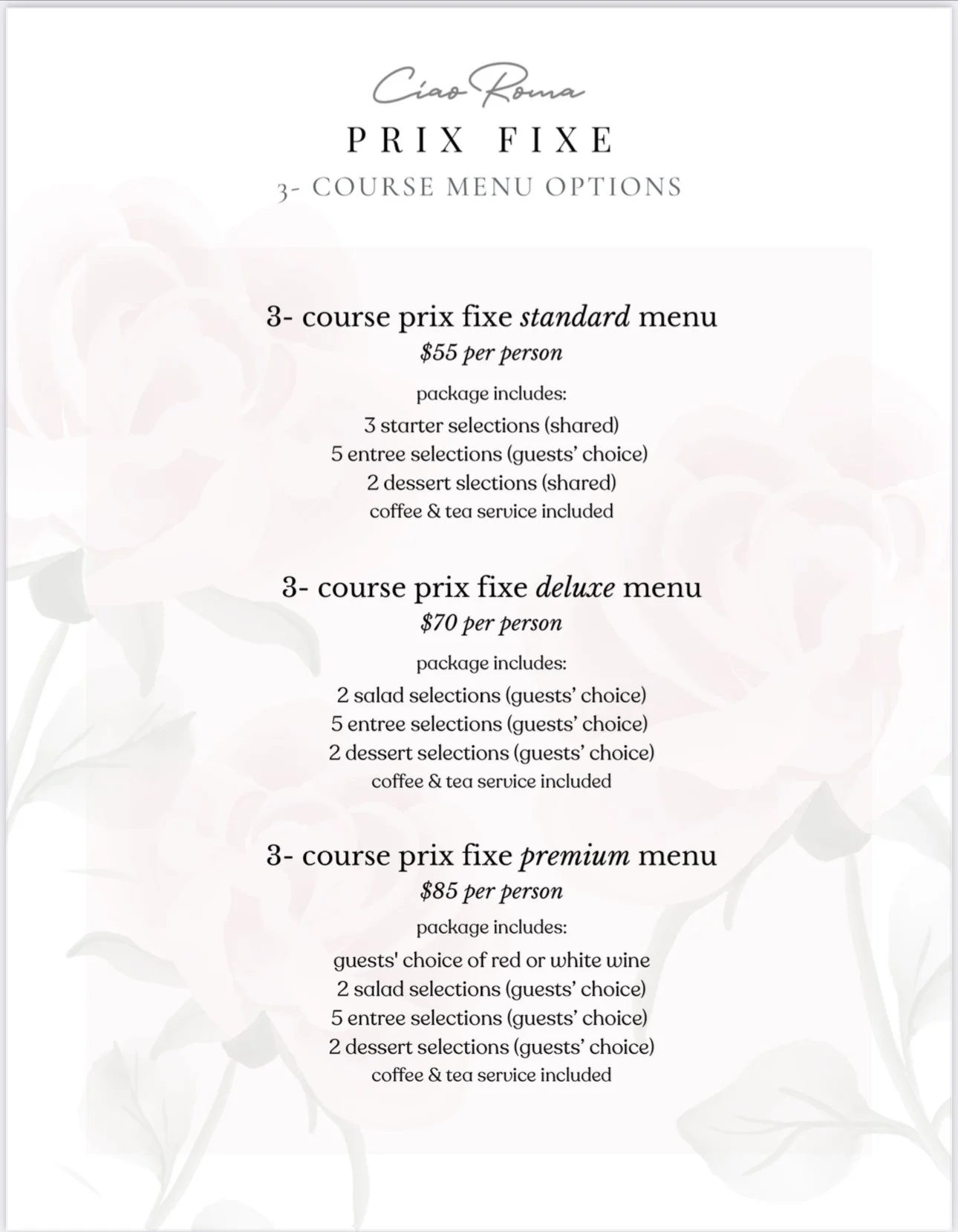 Please scroll down for photos and sample menus.